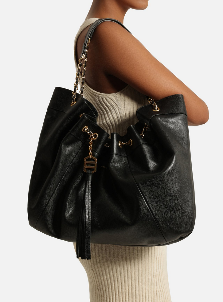 Bolsa feminina shopping grande de couro preta. O acessório tem formato macio e amplo. Traz alças de ombro em correntes com tiras de couro entrelaçadas, que passam por ilhoses na parte superior formando franzidos, além de ombreiras. Possui fecho em imã e bag charm em peça de metal e barbicacho.
