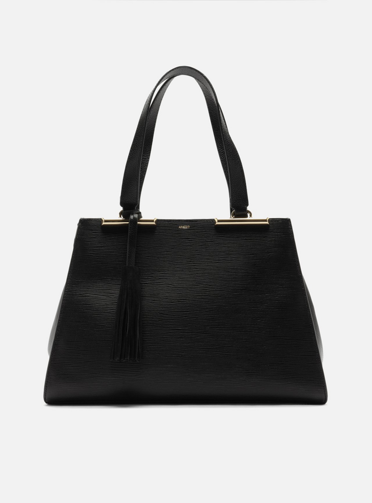 Bolsa shopping grande de couro preta. O acessório tem formato estruturado, acabamento texturizado wave, base mais larga e inscrição discreta do nome da marca. Traz alças de ombro presas por metais dourados na base. Com fecho superior em zíper e puxador em tira. Acompanha bag charm em barbicacho de camurcina, preso à bolsa por tira fina.