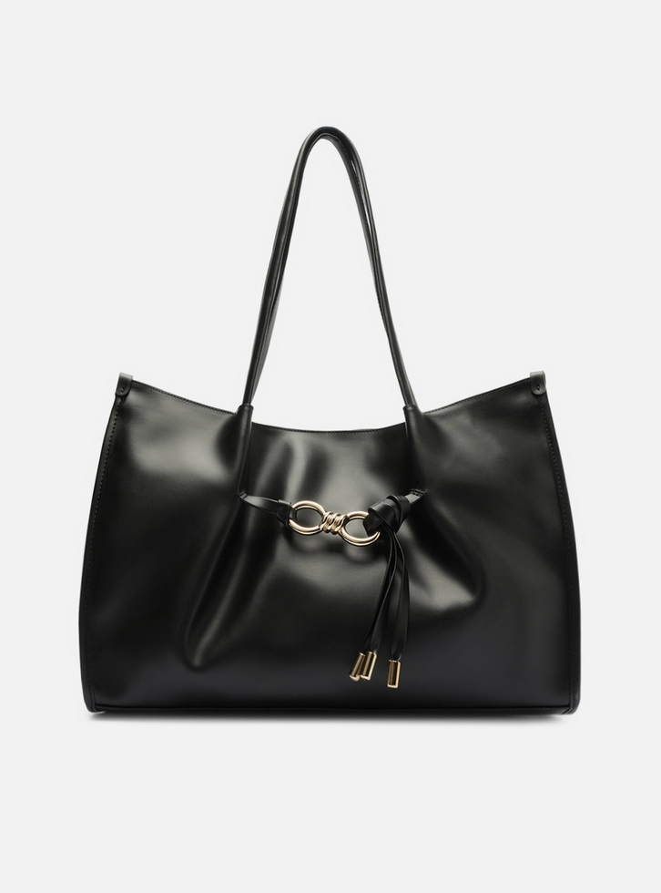 Bolsa shopping grande preta. O acessório tem formato estruturado e acabamento macio. Traz duas alças de ombro. Possui fecho em imã. Com detalhe em peça de metal em forma de elos, presa por tiras e nó na capa frontal.