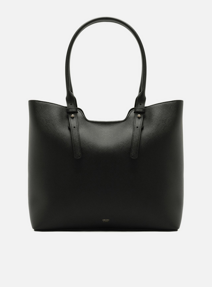 Bolsa feminina shopping grande preta. O acessório tem formato estruturado e acabamento texturizado. Possui alças de ombro finas e alongadas, fecho interno em botão de pressão e amplo espaço interno. Traz pouch removível presa por tira fina com botão e inscrição discreta do nome da marca na parte frontal.
