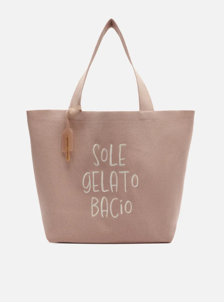 Bolsa shopping grande rosa em crochê. Com formato amplo e maleável, traz alças de ombro largas e inscrição “Sole, Gelato, Bacio” bordada na parte frontal. Acompanha bag charm de picolé exclusivo da collab Brizza + Bacio Di Latte.