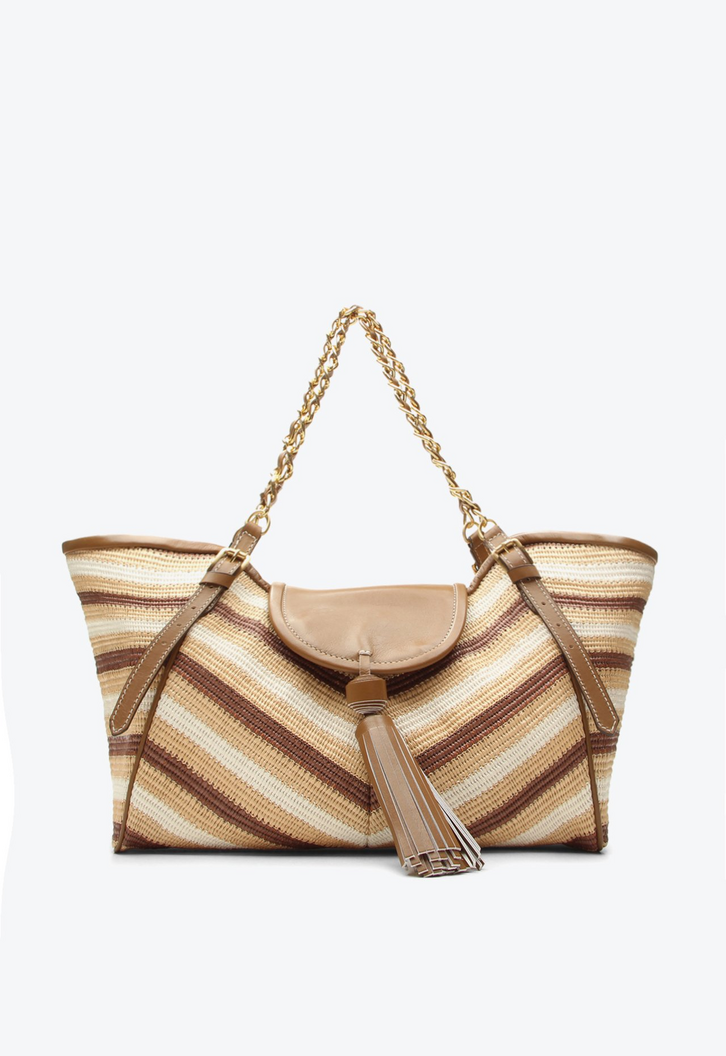 Bolsa shopping Tainá grande multicolor em tramado. Com alça de mão em corrente e adorno frontal com franjas no fechamento, esse modelo une estilo e praticidade. Espaçosa, permite levar tudo o que você precisa com facilidade, sendo perfeita para o dia a dia. O visual ressalta a energia e o frescor da estação, tornando o modelo a companhia ideal para os looks de verão.