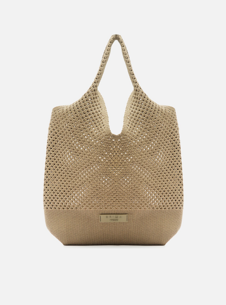 Bolsa shopping grande em tecido e crochê verde. O acessório tem formato amplo, laterais arredondadas e capas tramadas e vazadas. Traz alças de ombro curtas e tramadas e não possui fechamento. Com base em ponto fechado e tag emborrachada do nome da marca na capa.
