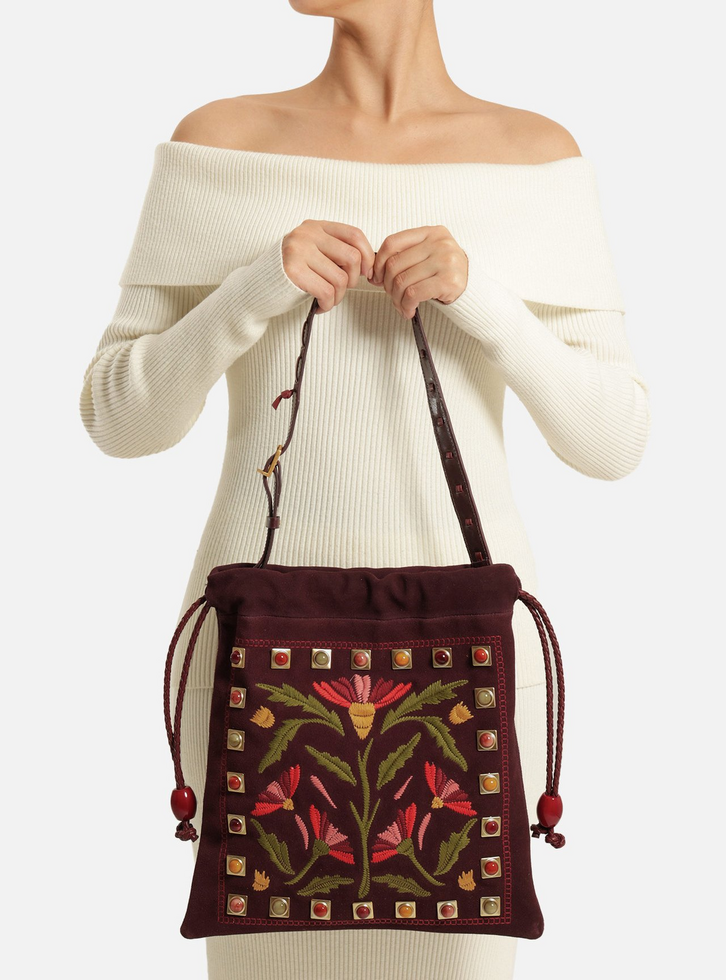 Bolsa tiracolo grande acamurçada bordô. O acessório tem formato macio e bordado floral colorido na capa. Traz alça de ombro de couro regulável por fivela com tira fina transpassada. Possui fecho em enforcador. Com aplicação de metais com pedras no contorno.