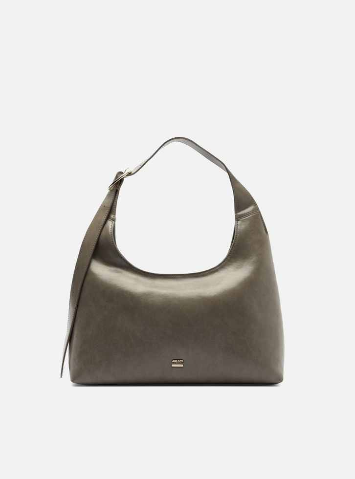Bolsa feminina shoulder cinza média. O acessório possui formato hobo e base retangular, em material liso com acabamento de alto brilho. Traz alça de ombro de espessura média, fixa ao corpo da bolsa, que é regulável através de uma fivela metálica na lateral. Aplicação em relevo metálico do nome da marca, na parte inferior frontal. Fechamento em zíper.