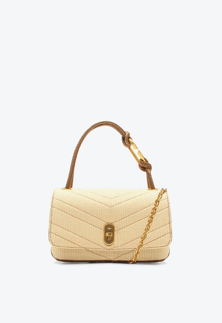 Bolsa shoulder Donatella pequena bege em palha. Com alça de mão adornada por detalhe metalizado e alça tiracolo em corrente, esse modelo apresenta textura tramada que traduz o mood natural e leve da estação. Compacta e sofisticada, é perfeita para quem busca um acessório prático sem abrir mão do estilo. O design delicado fazem dela uma escolha versátil, ideal para acompanhar looks de verão, do dia à noite, com um toque moderno e elegante.
