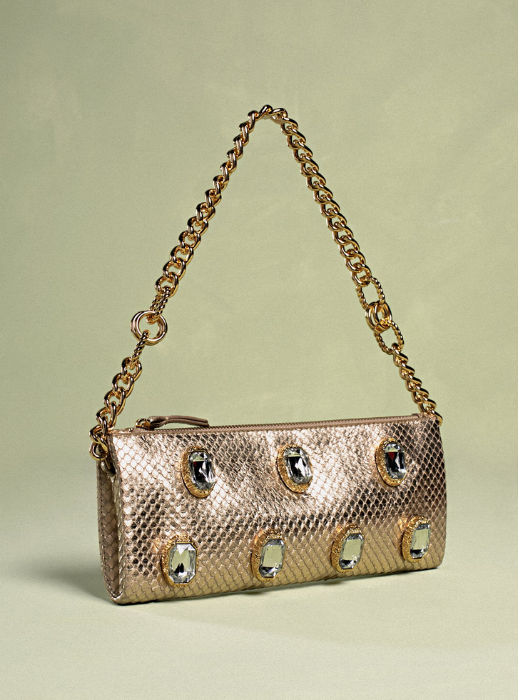 Bolsa feminina shoulder grande dourada, em material com textura snake. O acessório tem formato alongado e estruturado. Possui alça curta em corrente metálica dourada com elos diferenciados e fecho superior em zíper com puxador. Conta com aplicação de pedras decorativas na capa.