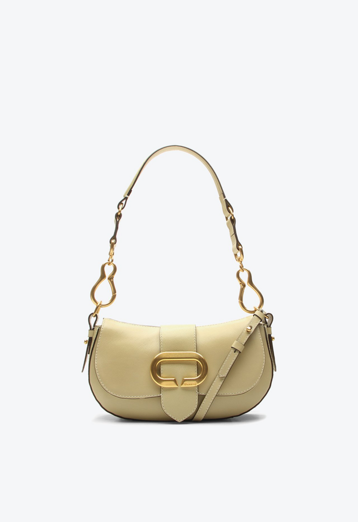 Bolsa shoulder Fly pequena em couro bege. Com alça de mão e alça tiracolo com detalhes dourados, essa bolsa apresenta fivela frontal estilo cinto exclusiva VCZ, trazendo um toque sofisticado e único ao design. Compacta, é perfeita para levar itens essenciais do dia a dia, como carteira, celular e acessórios. Combina facilmente com vestidos, saias, calças ou conjuntos casuais.