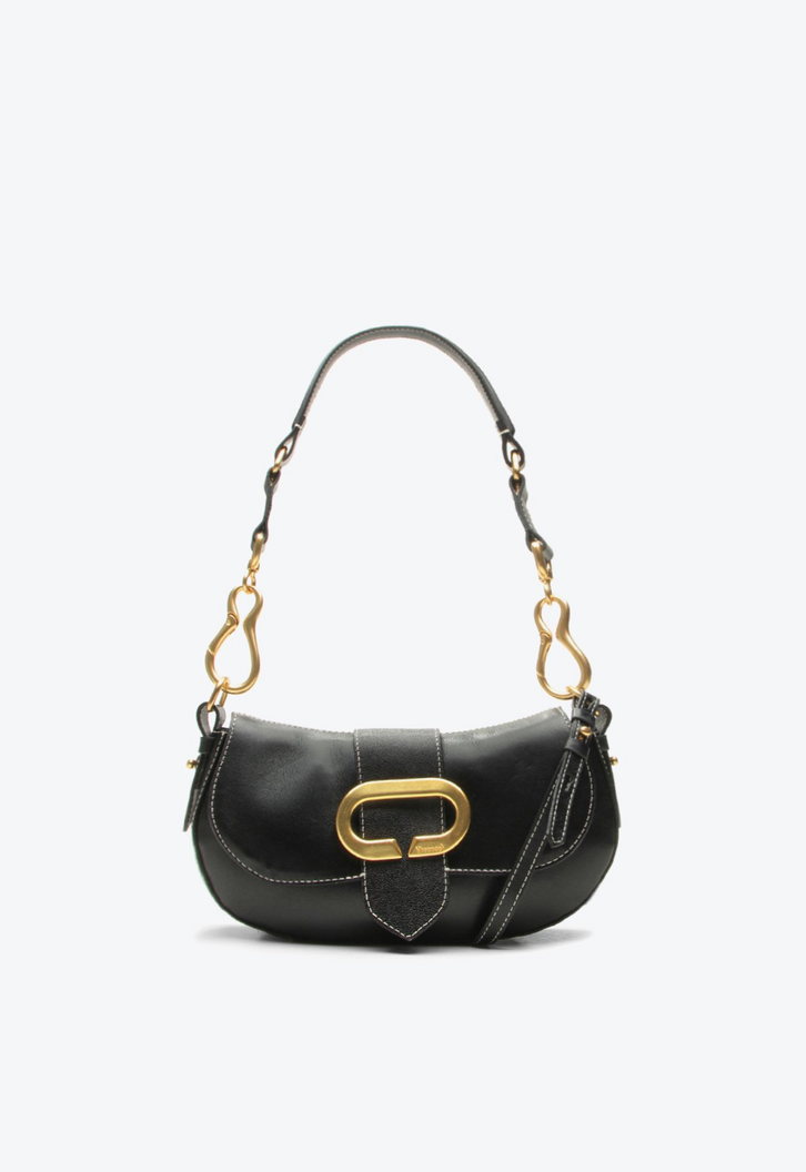Bolsa shoulder Fly pequena em couro preto. Com alça de mão e alça tiracolo com detalhes dourados, essa bolsa apresenta fivela frontal estilo cinto exclusiva VCZ, trazendo um toque sofisticado e único ao design. Compacta, é perfeita para levar itens essenciais do dia a dia, como carteira, celular e acessórios. Combina facilmente com vestidos, saias, calças ou conjuntos casuais.