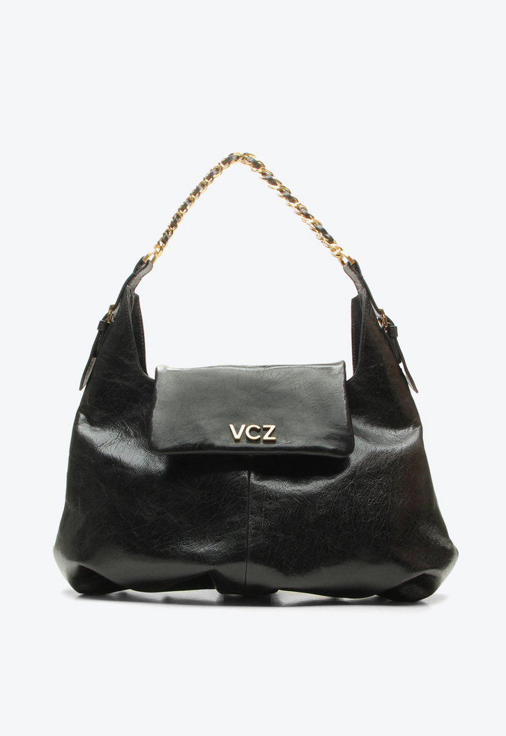 Bolsa shoulder grande Harper em couro preto. Modelo em couro craked, a bolsa possui alça de mão em corrente que adiciona um toque elegante ao design. Com formato amplo e flexível, oferece espaço ideal para carregar todos os itens essenciais do dia a dia, enquanto o logo VCZ frontal em dourado reforça a assinatura da marca com sofisticação. Versátil e marcante, a bag se torna a protagonista dos looks mais sofisticados, agregando estilo e presença em qualquer produção.