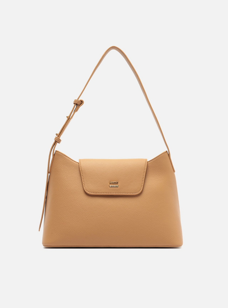 Bolsa feminina shoulder nude em formato estruturado, confeccionada em material de textura granulada. O acessório possui alça de ombro ajustável por fivelas e pinos metálicos. Possui aba frontal com fechamento por botão magnético oculto, e traz uma discreta aplicação metálica com o nome da marca.