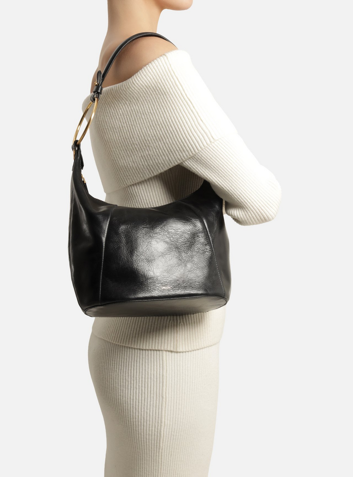 Bolsa shoulder média em couro preto. O acessório tem formato estruturado, laterais arredondadas, acabamento macio e brilho suave. Traz alça curta de ombro com argolas metálicas ovaladas nas laterais. Possui fecho superior em zíper com puxador e parte interna forrada.