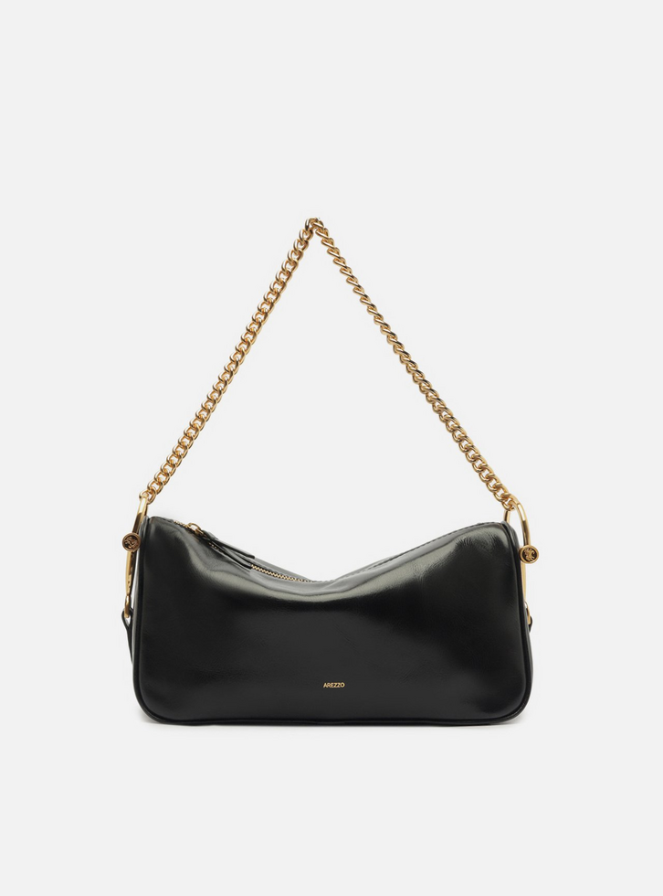 Bolsa shoulder média de couro preta. O acessório tem formato estruturado e alongado. Traz alça de ombro em corrente metálica dourada, presa por metais robustos nas laterais. Possui fecho superior em zíper com puxador.