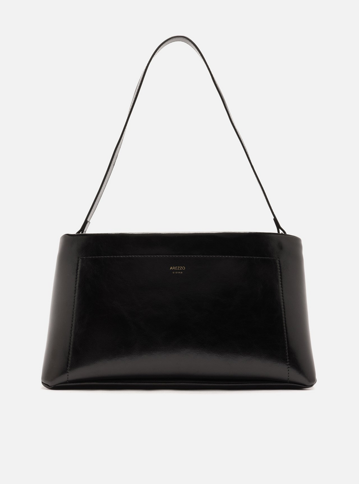 Bolsa shoulder grande preta. O acessório tem formato estruturado e alça curta de ombro, presa por argolas metálicas nas laterais. Traz detalhe frontal em costura pesponto e inscrição do nome da marca. Possui fechamento superior em zíper e forro interno.