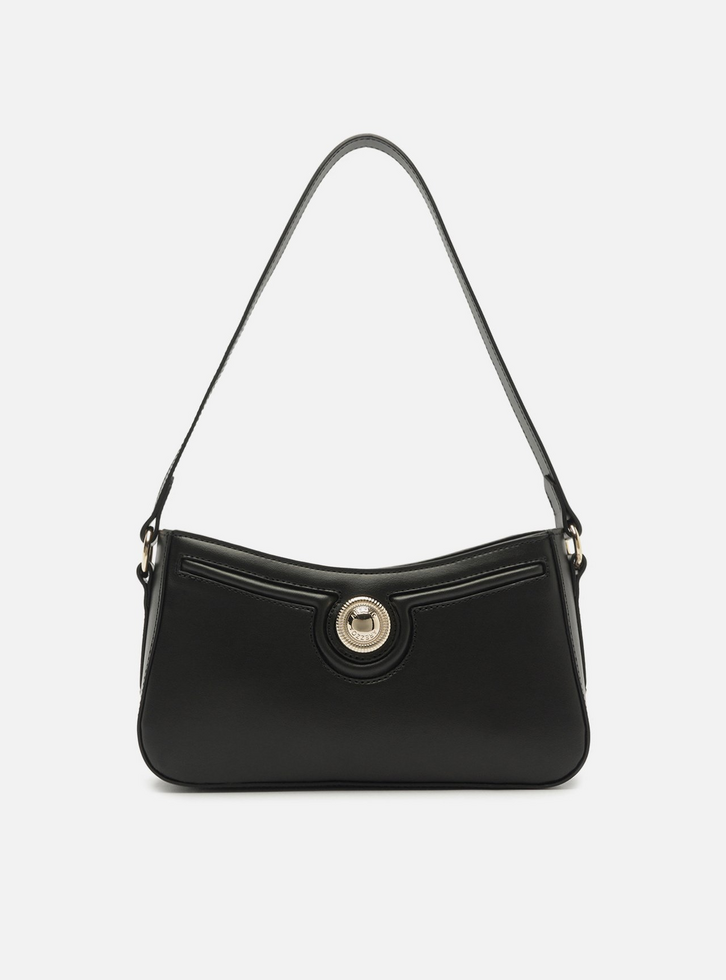 Bolsa shoulder média preta. O acessório tem formato retangular e estruturado, laterais arredondadas e acabamento liso. Traz alça curta de ombro. Na capa, conta com detalhe em relevo, costuras em pesponto e peça metálica texturizada com o nome da marca no centro. Possui fecho superior em zíper e puxador.