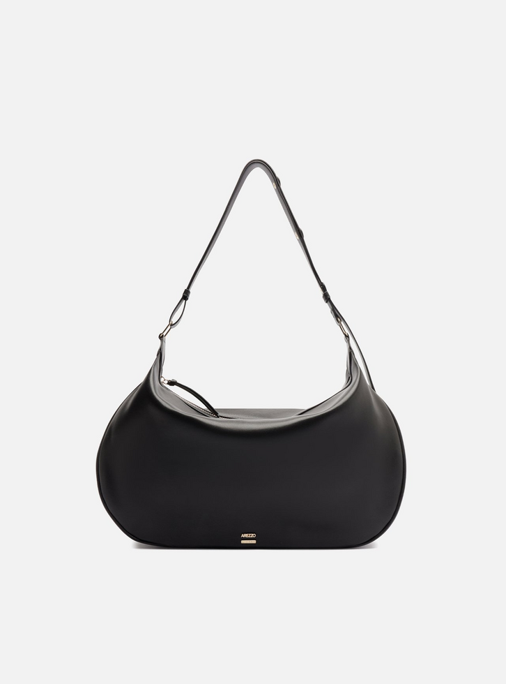 Bolsa feminina shoulder preta média. O acessório possui formato orgânico e arredondado, em material liso. Traz alça de ombro de espessura média, ajustável por botões de pressão metálicos e mosquetões laterais. Aplicação em relevo metálico do nome da marca, na parte inferior frontal. Fechamento em zíper com puxador em tira.