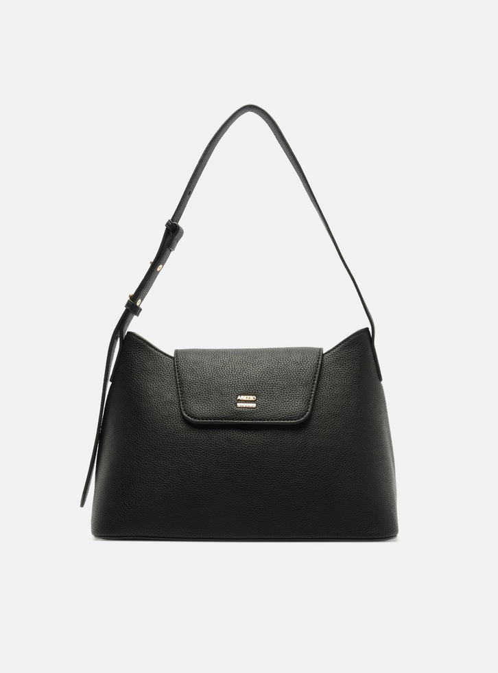 Bolsa feminina shoulder preta em formato estruturado, confeccionada em material de textura granulada. O acessório possui alça de ombro ajustável por fivelas e pinos metálicos. Possui aba frontal com fechamento por botão magnético oculto, e traz uma discreta aplicação metálica com o nome da marca.