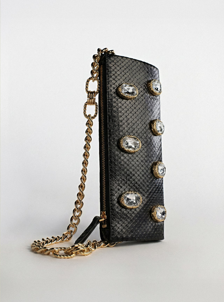 Bolsa feminina shoulder grande preta, em material com textura snake. O acessório tem formato alongado e estruturado. Possui alça curta em corrente metálica dourada com elos diferenciados e fecho superior em zíper com puxador. Conta com aplicação de pedras decorativas na capa.