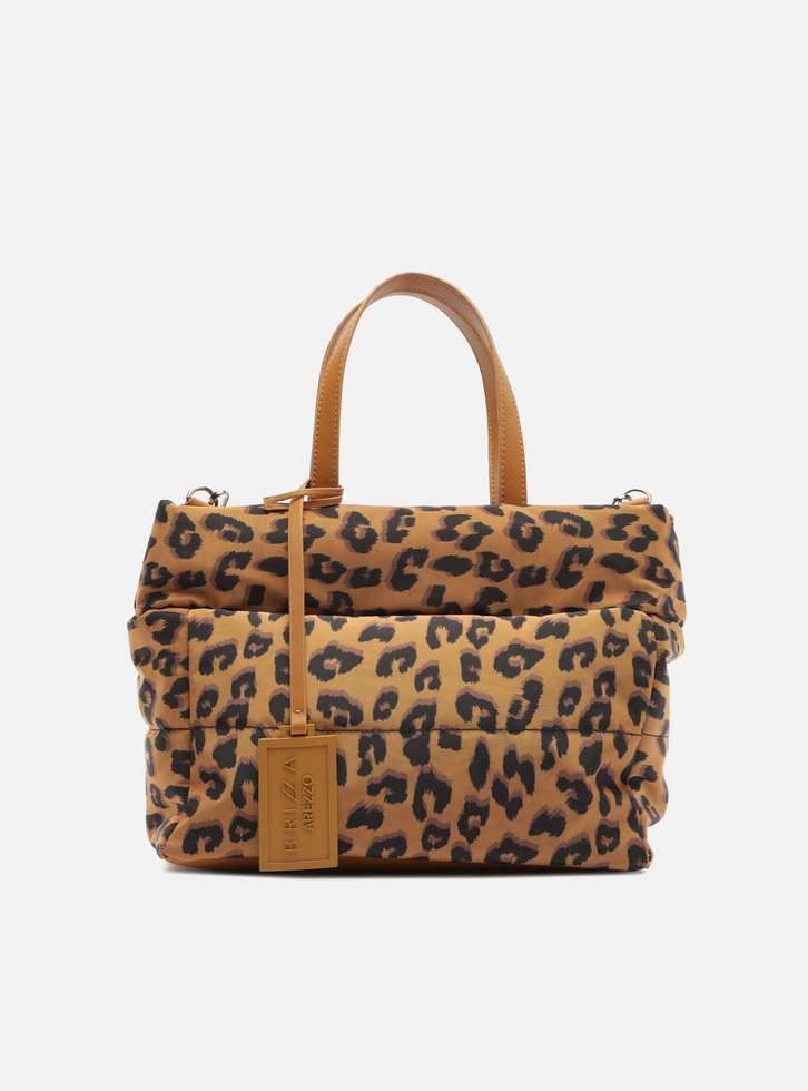 Bolsa tiracolo pequena em nylon com estampa animal print. O acessório tem formato estruturado, duas alças de mão e alça longa lateral, removível, regulável e em gorgurão com inscrição Arezzo Brizza. Traz capas com costuras estofadas, fecho superior em zíper e bag charm emborrachado com nome da marca.