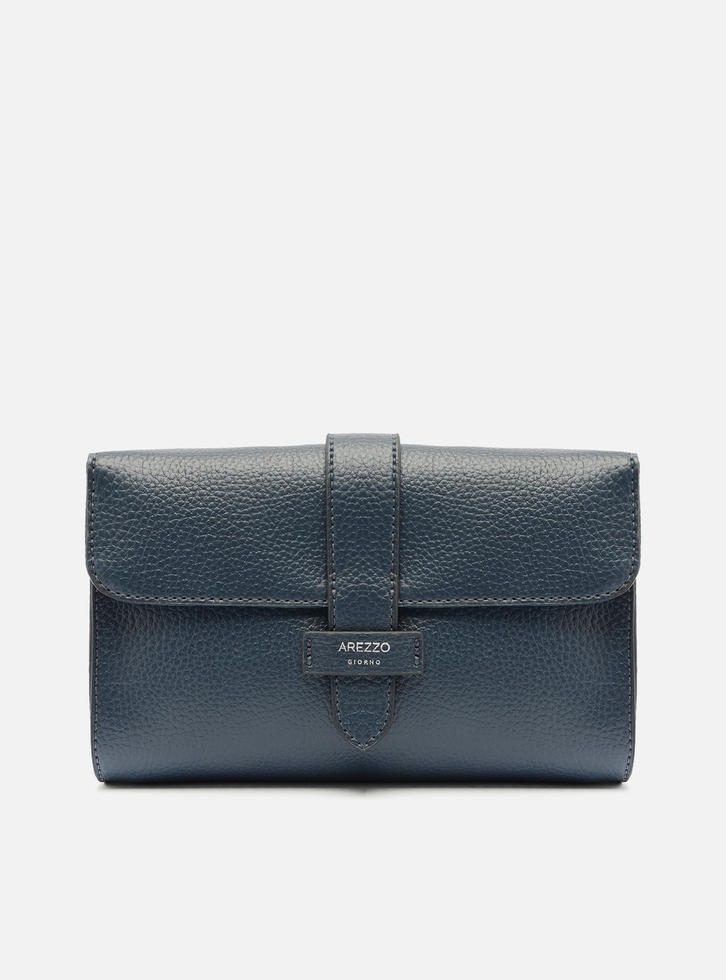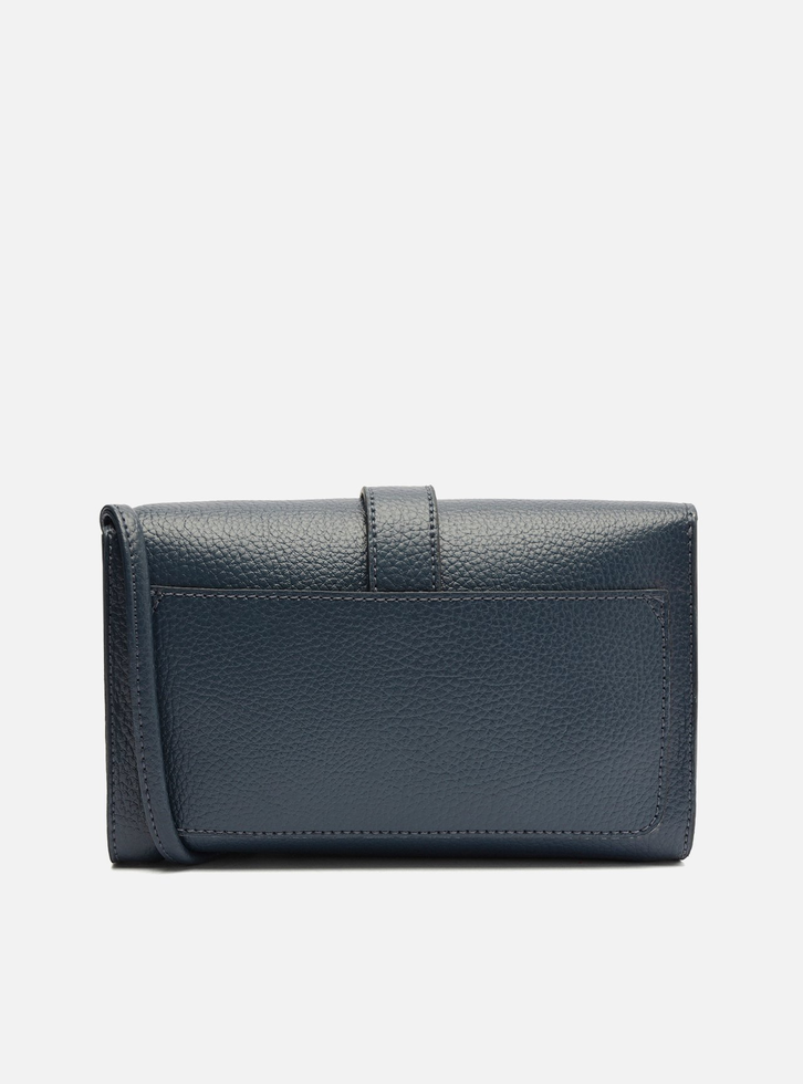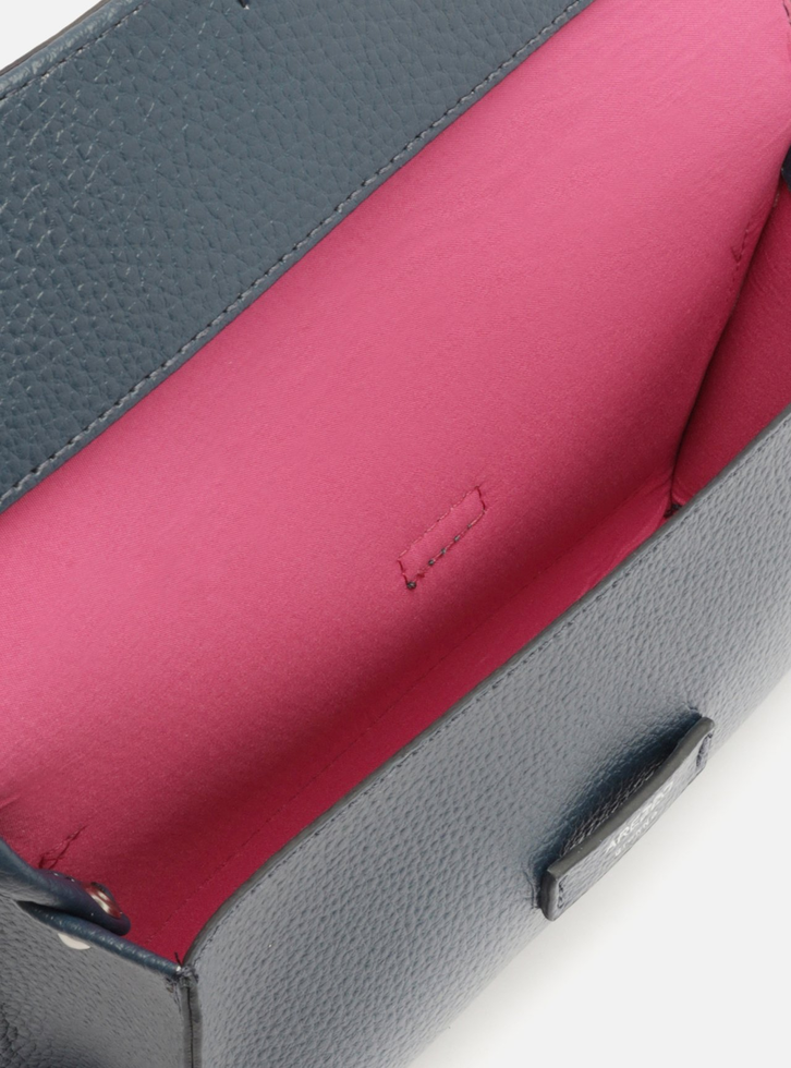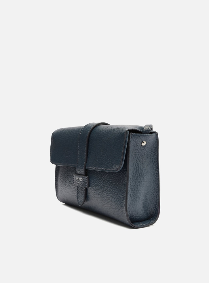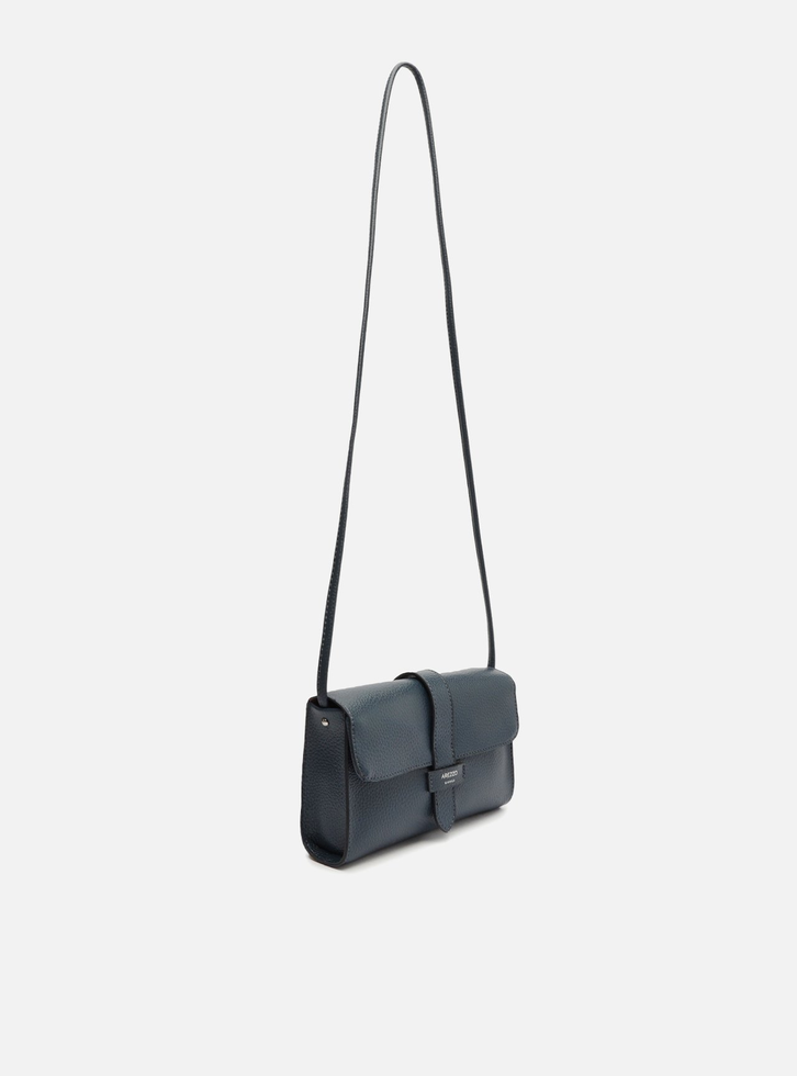 Bolsa tiracolo pequena azul. O modelo tem formato retangular, laterais arredondadas e acabamento texturizado. Traz alça lateral fina e fecho em tampo frontal com encaixe em tira e detalhe do nome da marca.