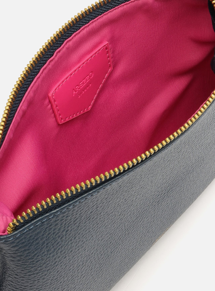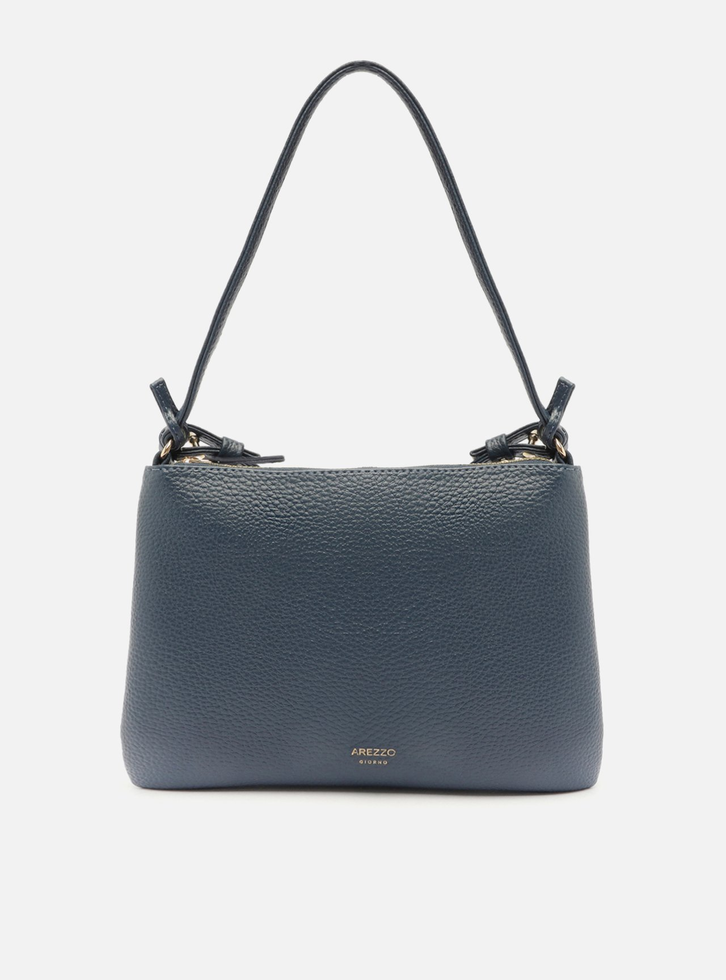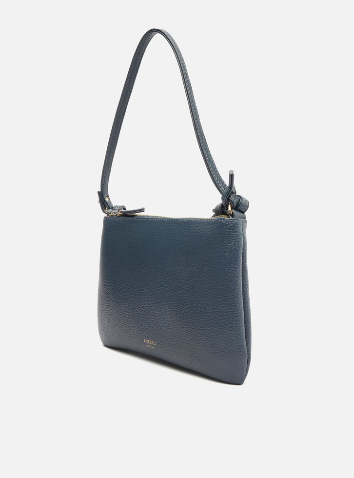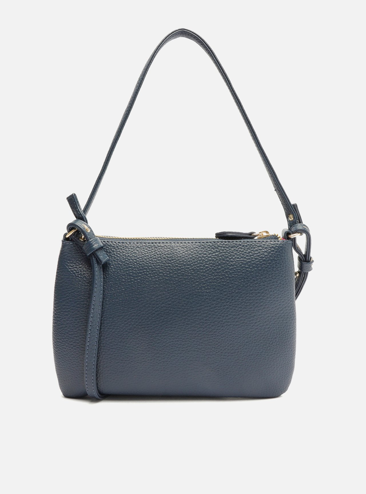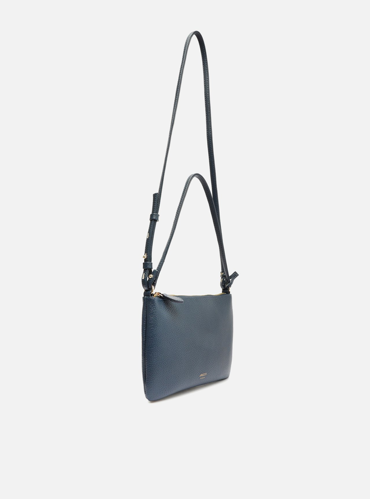 Bolsa tiracolo pequena azul. O modelo tem formato retangular, laterais arredondadas e acabamento texturizado. Traz alça lateral e alça curta de ombro, ambas em tiras finas, reguláveis e removíveis. Possui fecho em zíper e puxador. Com inscrição do nome da marca na capa.