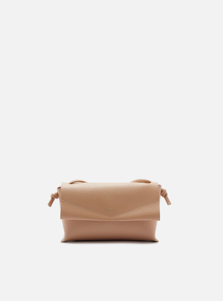 Bolsa tiracolo pequena bege. O acessório tem formato estruturado e retangular, laterais arredondadas e acabamento liso. Traz alça tiracolo em tira presa nas laterais por nós. Possui fecho em tampo frontal com detalhe em costuras, imã interno e inscrição discreta do nome da marca.