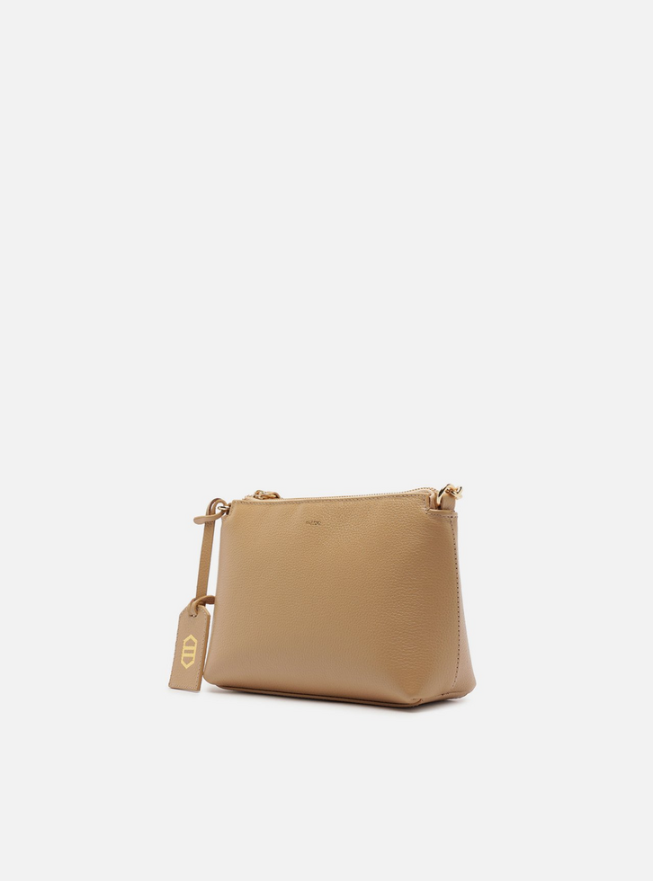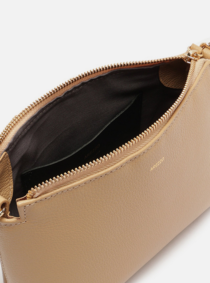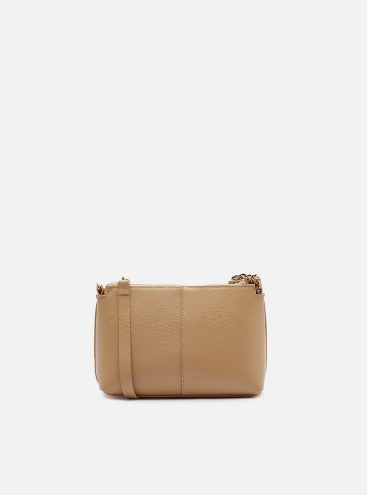 Bolsa feminina tiracolo pequena em couro bege. O acessório tem formato estruturado e acabamento levemente texturizado. Possui alça lateral regulável em tira de couro, presa por correntes metálicas douradas. Conta com fecho superior em zíper com puxador. Acompanha bag charm preso por tira à bolsa, com detalhe em metal geométrico dourado.