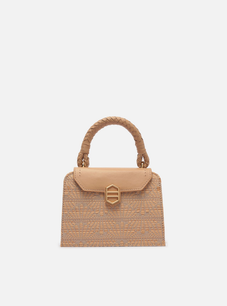 Bolsa feminina tiracolo pequena em couro bege e tecido tramado. O acessório tem formato estruturado e capas em tecido tramado com estampa tropical. Possui alça de mão superior em tira trançada e alça lateral regulável e removível, garantindo diferentes formas de uso. Conta com fecho frontal em tampo e aplicação metálica geométrica dourada.