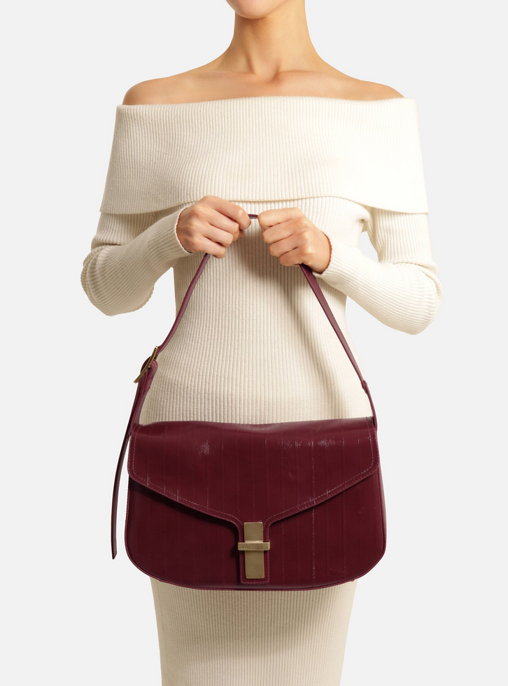 Bolsa tiracolo grande de couro bordô. O acessório tem formato estruturado, laterais arredondadas e acabamento com costuras verticais. Traz alça de ombro regulável por fivela metálica. Possui fecho em tampo frontal com recorte, tira e encaixe, além de peça metálica dourada escovada.
