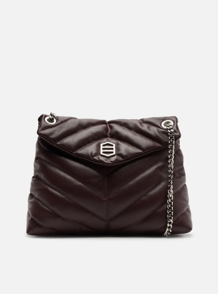 Bolsa tiracolo grande de couro bordô. O acessório tem formato estruturado, acabamento em couro macio com costuras em matelassê marcadas, além de aplicação de peça metálica com formato geométrico e vazado no tampo. Traz alça em corrente metálica e ombreira, presa à bolsa na parte superior por metais vazados. Possui fecho em tampo frontal e imã interno.