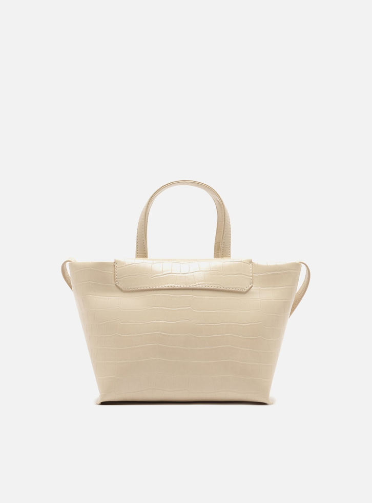 Bolsa tiracolo média branca. O acessório tem formato estruturado, laterais retas e acabamento texturizado. Traz alça lateral regulável, duas alças de mão e fecho magnético.