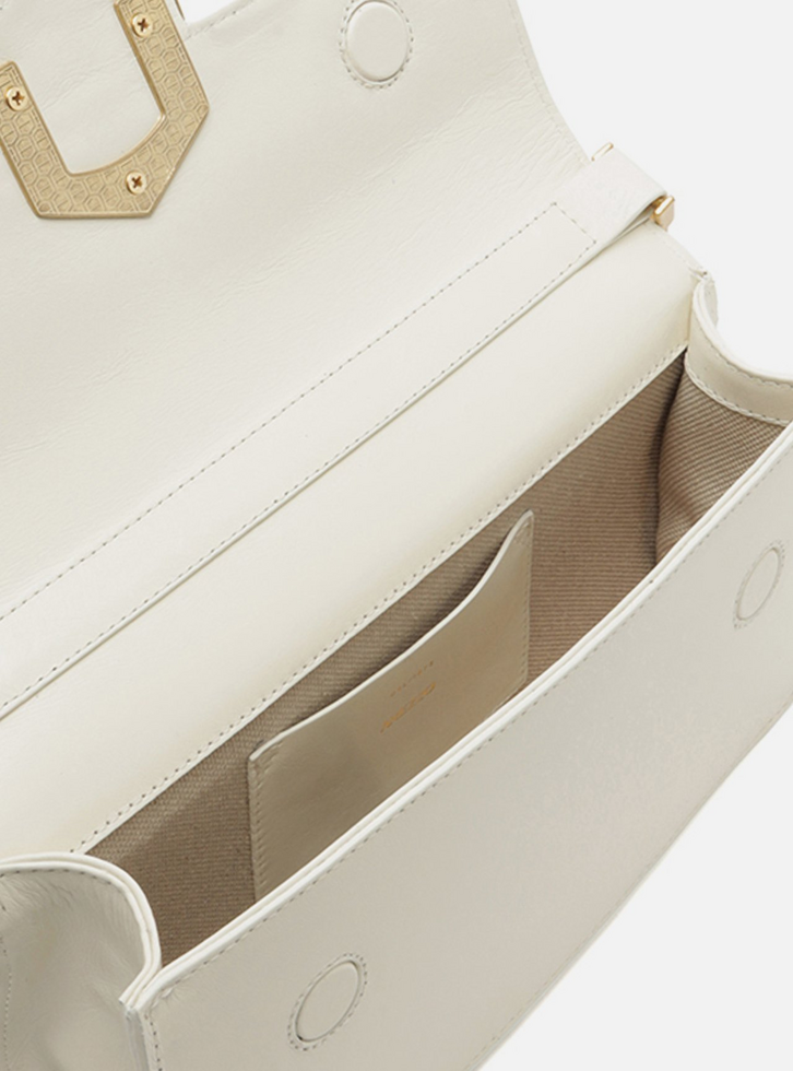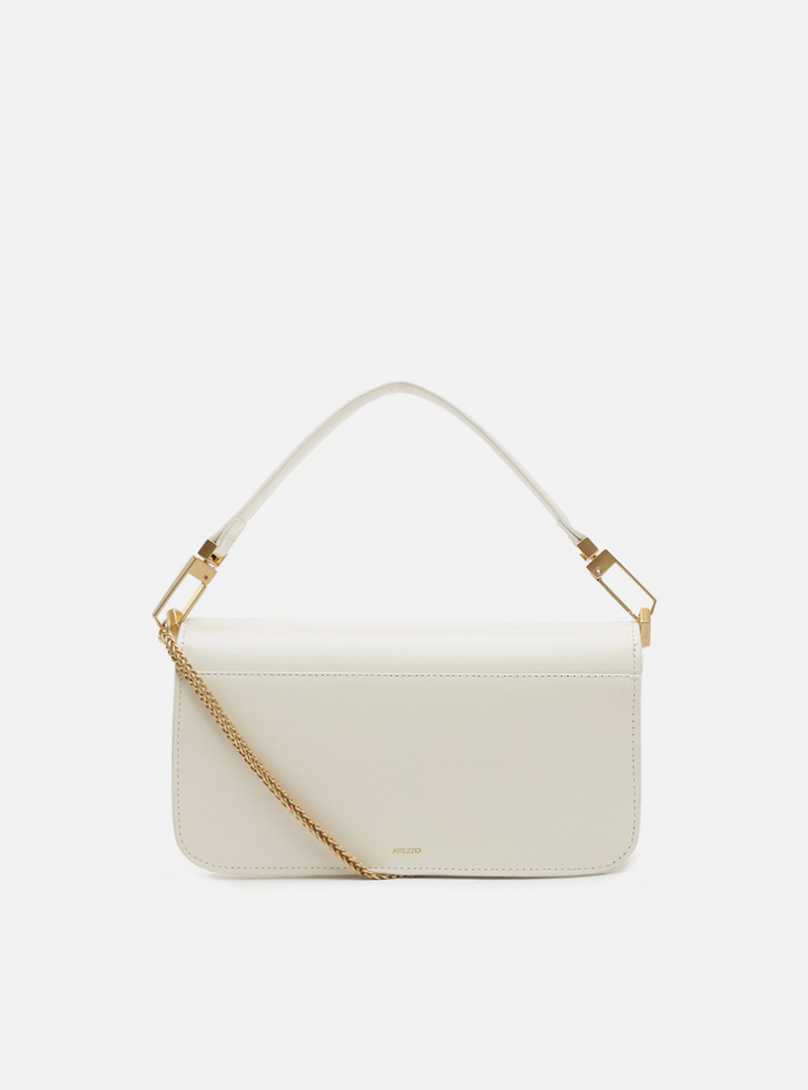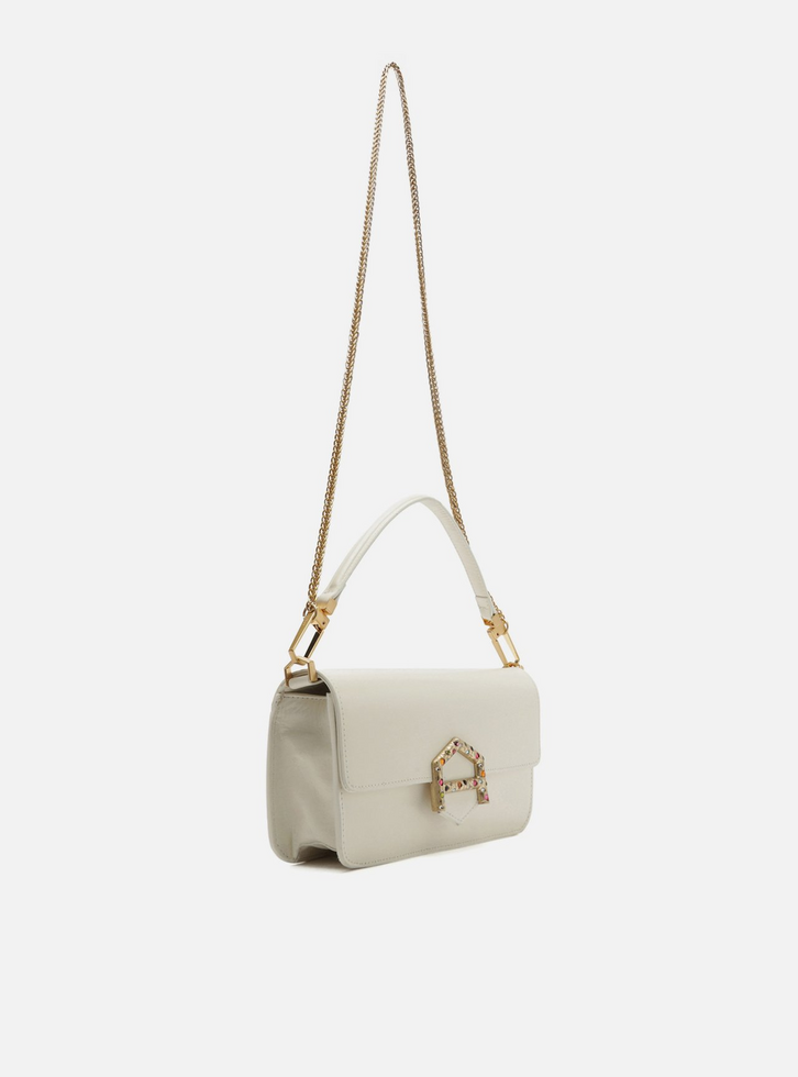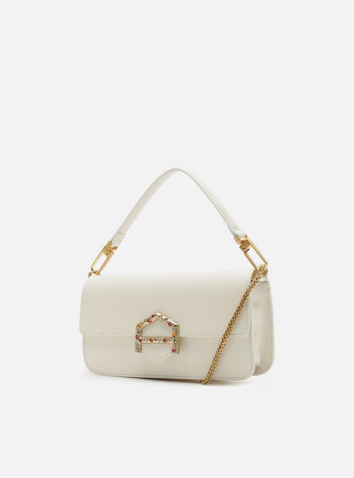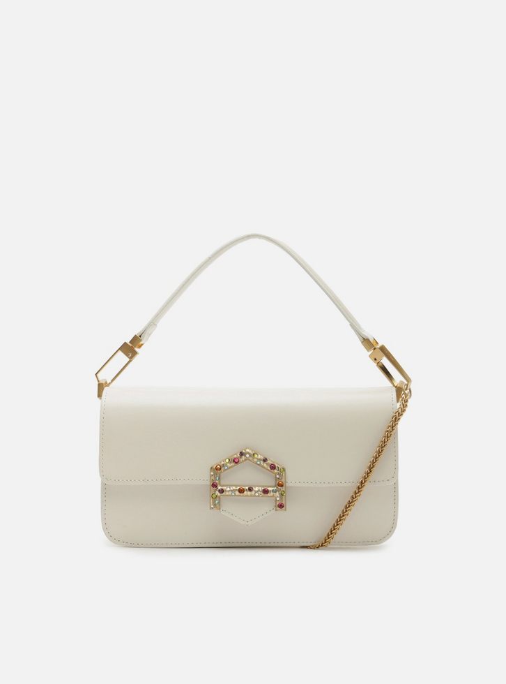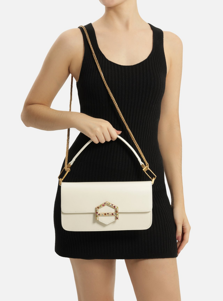 Bolsa tiracolo média em couro branca. O acessório tem formato estruturado e retangular, estilo baguete, e laterais arredondadas. Traz alça tiracolo em corrente dourada fina e removível e alça curta em tira larga, presa por ganchos imponentes. Com fecho em tampo frontal e imãs internos, além de tala com detalhe em peça metálica vazada com formato de A geométrico e aplicação de pedras coloridas. Apresenta forro e bolso interno.
