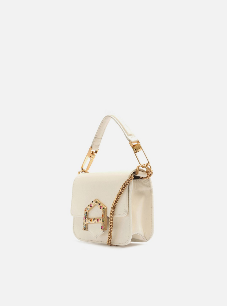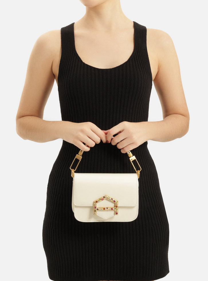 Bolsa tiracolo pequena em couro branca. O acessório tem formato estruturado e quadrado e laterais arredondadas. Traz alça tiracolo em corrente dourada fina e removível e alça curta em tira larga, presa por ganchos imponentes. Com fecho em tampo frontal e imãs internos, além de tala com detalhe em peça metálica vazada com formato de A geométrico e aplicação de pedras coloridas. Apresenta forro e bolso interno.