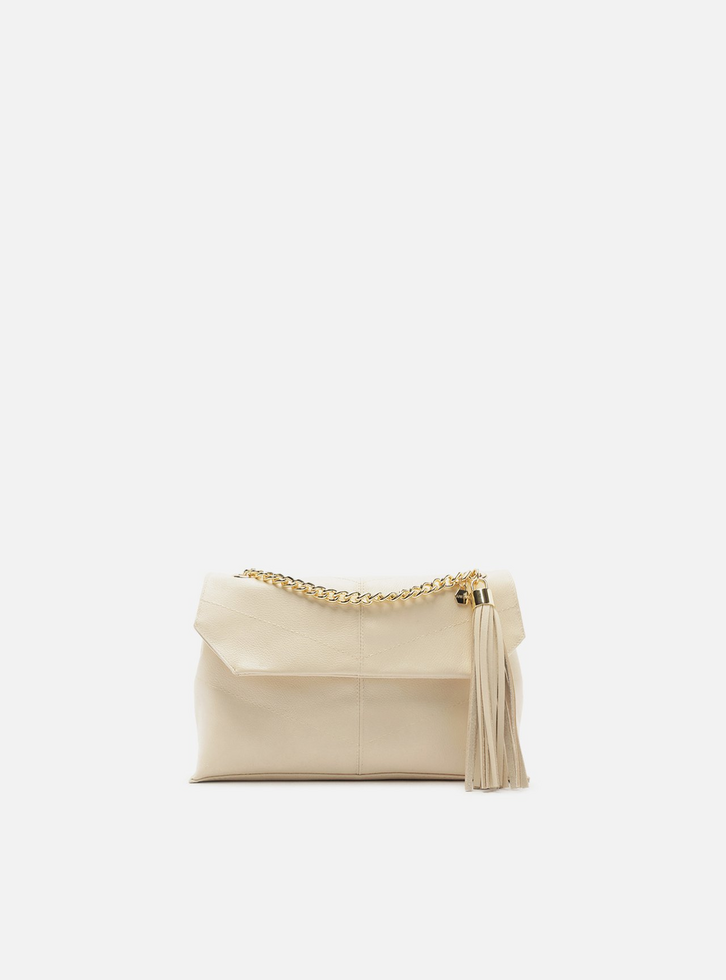 Bolsa tiracolo pequena de couro branca. O acessório tem formato retangular e costuras pesponto nas capas e emendas. Traz alça lateral em corrente metálica e tira de couro, que passa pela parte superior por ilhoses vazados. Com fecho em tampo frontal e imã. Detalhe em bag charm de barbicacho, preso à alça da bolsa.