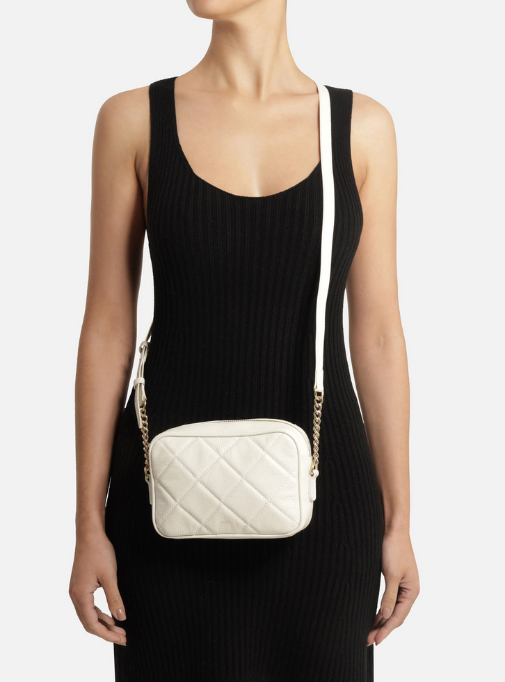 Bolsa tiracolo pequena branca de couro. O acessório tem formato quadrado, laterais arredondadas e capa com costuras em matelassê. Traz alça lateral em corrente, tira de couro regulável, fecho em zíper e puxador. Com inscrição do nome da marca na capa.