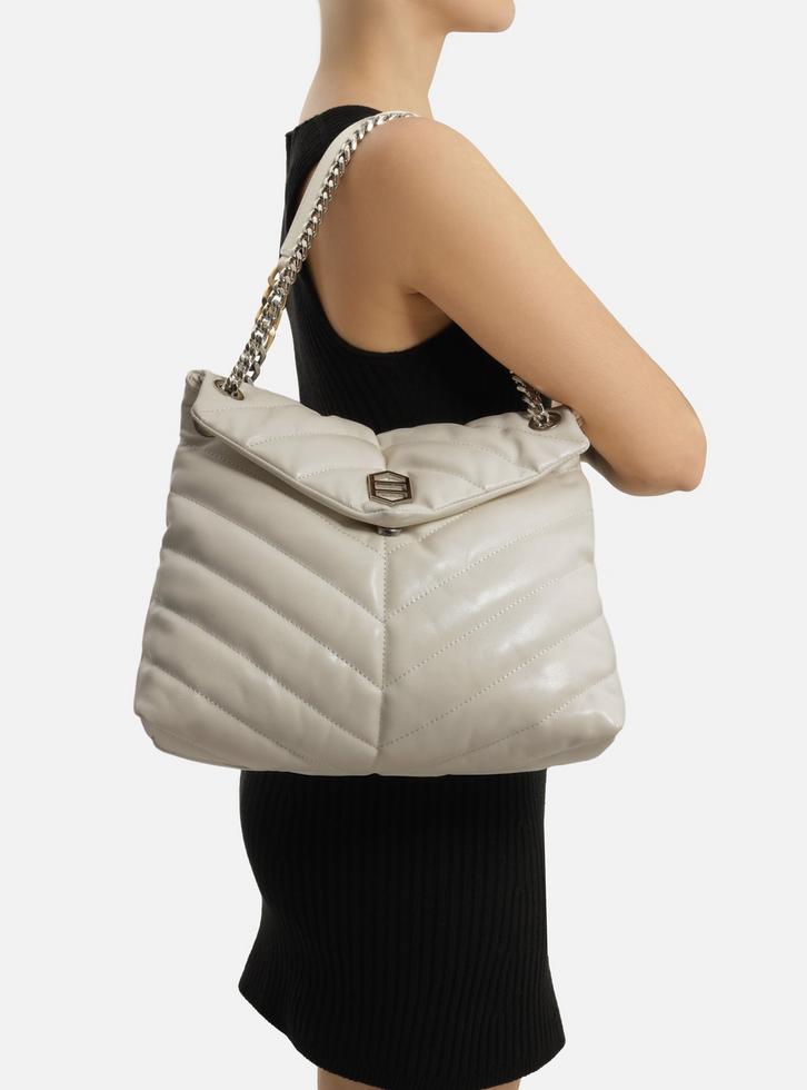 Bolsa tiracolo grande de couro branca. O acessório tem formato estruturado, acabamento em couro macio com costuras em matelassê marcadas, além de aplicação de peça metálica com formato geométrico e vazado no tampo. Traz alça em corrente metálica e ombreira, presa à bolsa na parte superior por metais vazados. Possui fecho em tampo frontal e imã interno.