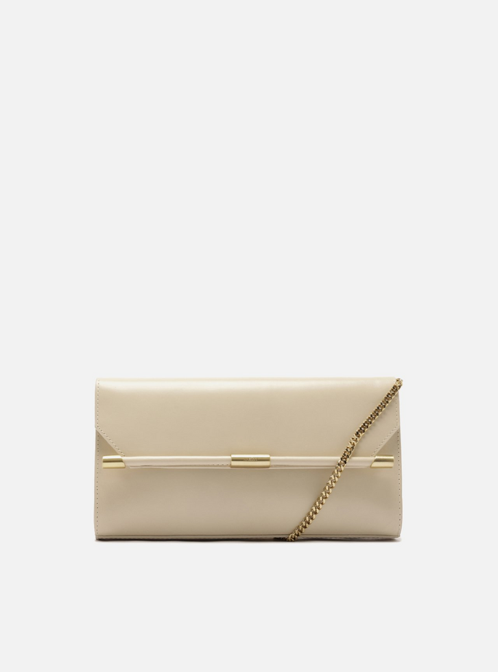 Bolsa tiracolo feminina média branca em couro. O acessório tem formato retangular estruturado e acabamento liso. Traz alça lateral fina em corrente metálica delicada. Possui tampo frontal com fecho em imãs internos e recortes geométricos nas laterais, além de detalhe em tira rolotê na capa com aplicações metálicas. Com interior forrado.