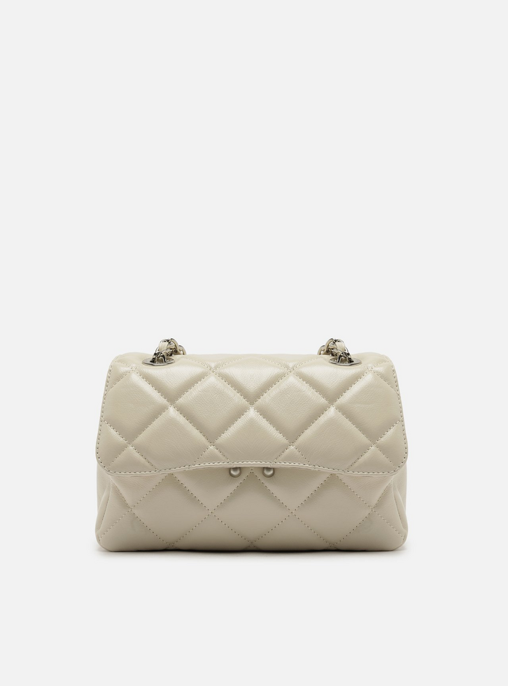 Bolsa tiracolo média de couro branco. O modelo tem formato estruturado, capa frontal e tampo com costuras em matelassê bombadas e inscrição discreta do nome da marca, além de capa traseira lisa. Traz alça em corrente metálica dupla com tiras de couro entrelaçadas e ombreiras, presa à bolsa na parte superior por metais vazados. Possui fecho em tampo frontal e encaixe em peça metálica. Com forro e divisória interna.