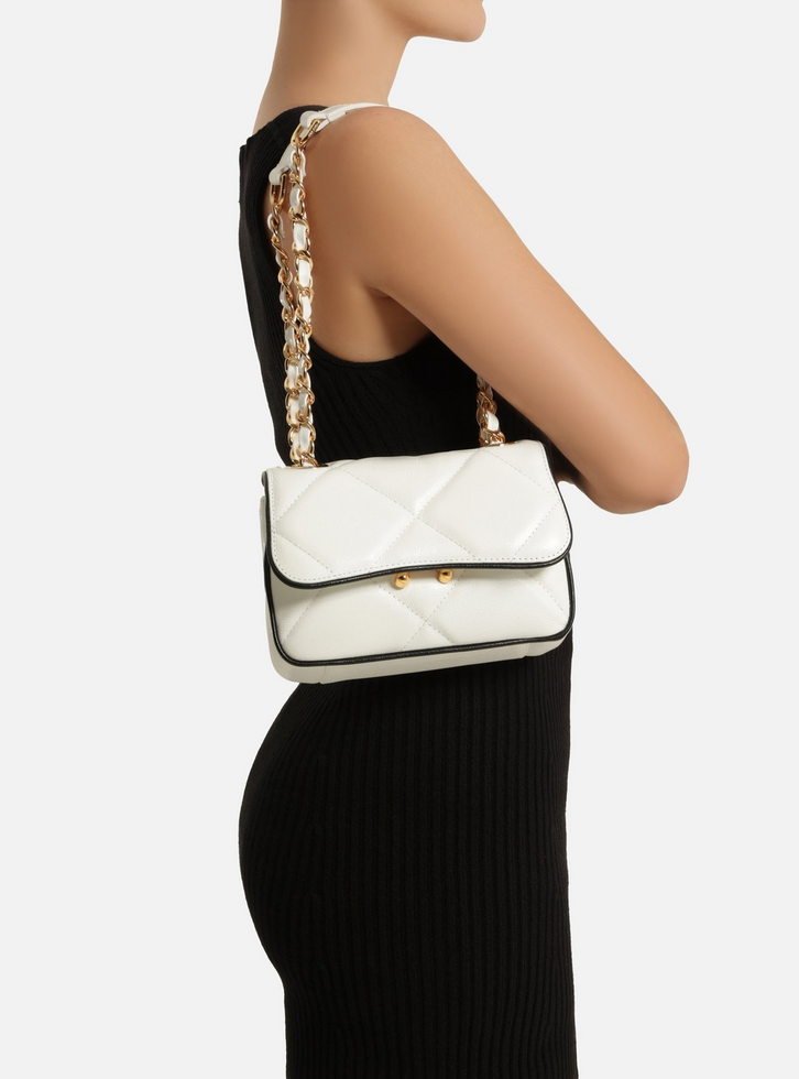 Bolsa tiracolo pequena de couro branca com contorno preto. O acessório tem formato estruturado, capa frontal e tampo com costuras em matelassê e inscrição discreta do nome da marca, além de capa traseira lisa. Traz alça em corrente metálica dupla com tiras de couro entrelaçadas e ombreiras, presa à bolsa na parte superior por metais vazados. Possui fecho em tampo frontal e encaixe em peça metálica. Com forro e divisória interna.