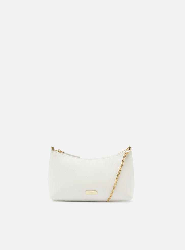 Bolsa feminina tiracolo pequena de couro branca. O acessório tem formato retangular e laterais arredondadas. Traz alça de ombro em corrente metálica dourada removível. Possui fecho em zíper com puxador. Com tag em metal do nome da marca na capa.