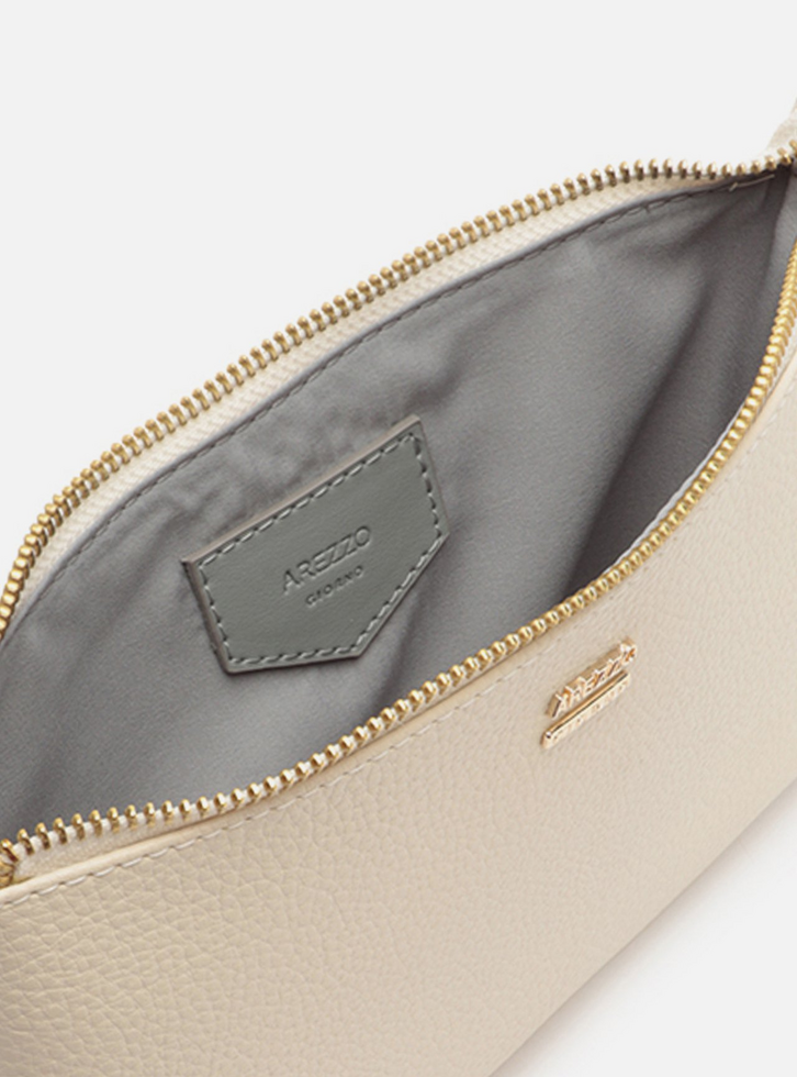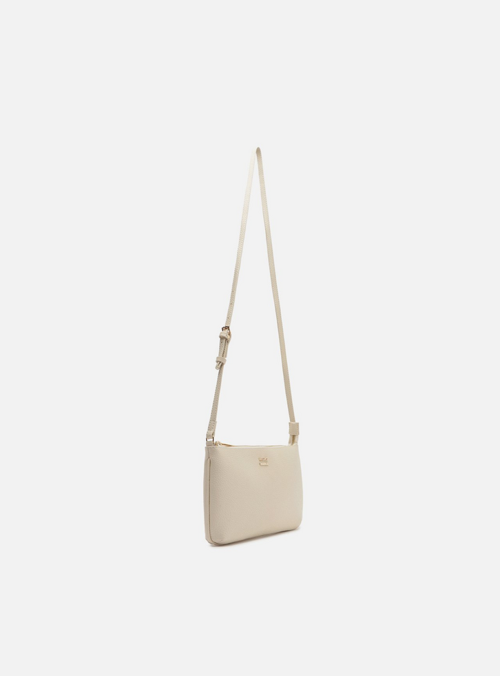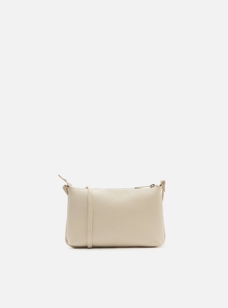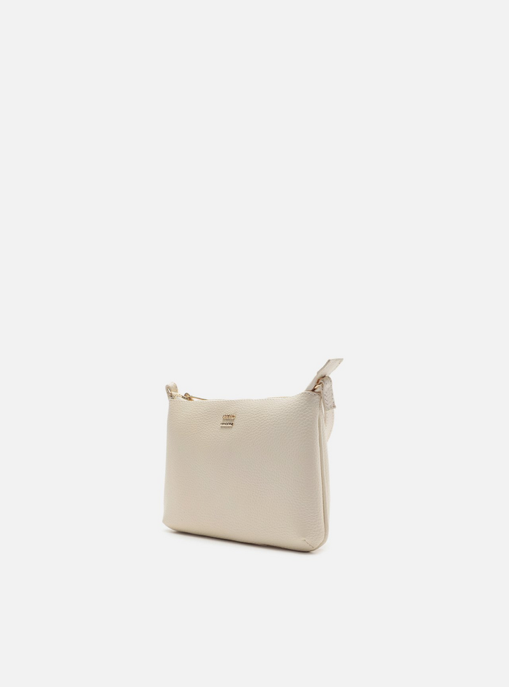 Bolsa feminina tiracolo pequena branca. O acessório tem formato retangular, laterais arredondadas e acabamento texturizado. Traz alça lateral fina e fecho em zíper e puxador. Com inscrição metálica em alto-relevo do nome da marca na capa.