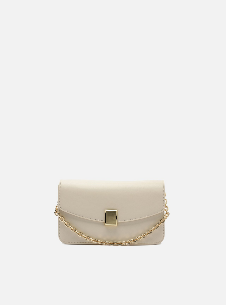 Bolsa feminina tiracolo branca pequena. O acessório possui formato retangular, estruturado e linhas limpas, em material liso. Traz alça longa em corrente metálica dourada. Tampo frontal em formato levemente curvo na borda, que se prende pelo fecho em peça metálica dourada, com inscrição do nome da marca.