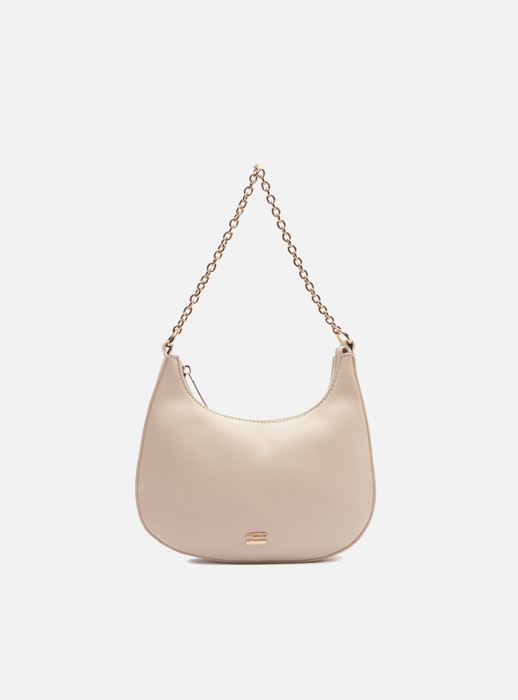 Bolsa feminina tiracolo pequena branca. O acessório tem formato meia-lua e estrutura maleável, com acabamento granulado e toque macio. Possui alça de ombro em corrente metálica e fecho superior em zíper. Traz inscrição do nome da marca na parte frontal em metal dourado.