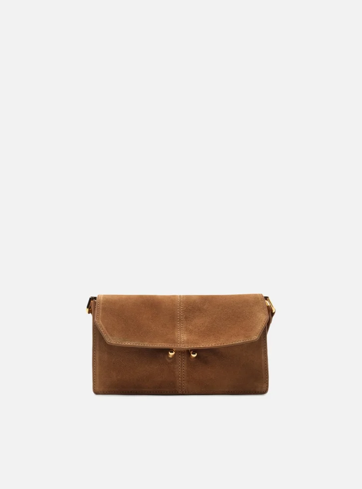 Bolsa tiracolo feminina pequena marrom em couro acamurçado. O acessório tem formato estruturado com laterais retas. Traz tampo frontal com fecho em peça de metal dourada e interno com divisórias, além de bolso pequeno em couro. Possui alça longa removível em couro, com regulagem por fivela.