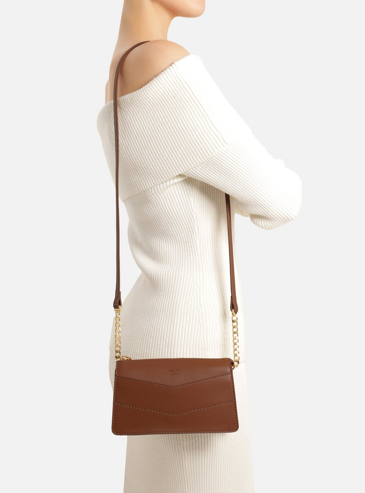 Bolsa tiracolo pequena marrom. O acessório tem formato estruturado, acabamento liso e inscrição discreta do nome da marca. Traz alça tiracolo fina com regulagem e correntes metálicas. Com fecho superior em zíper e puxador em tira. Com detalhe em costuras na capa.