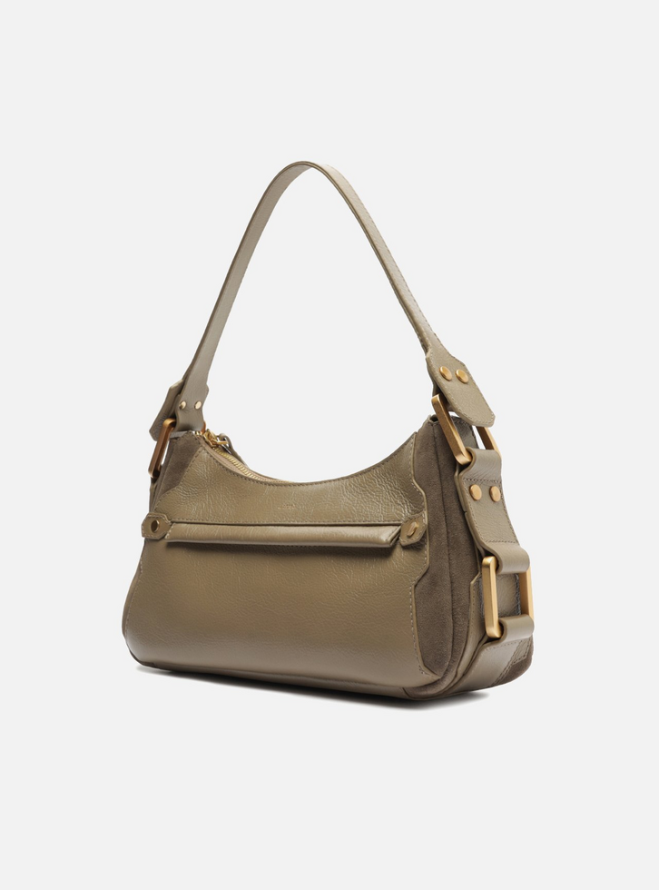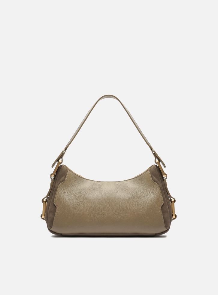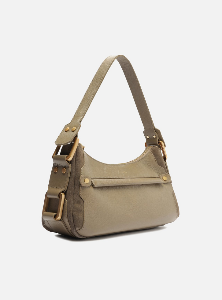 Bolsa tiracolo média em couro e camurça cinza. O acessório tem formato retangular, acabamento desgastado, recortes nas capas e aplicações em camurça. Traz alça de ombro presa por tiras largas sobre as capas, nas laterais, com metais imponentes. Com fecho superior em zíper e puxador em tira. Possui bolso externo frontal com fecho em zíper.