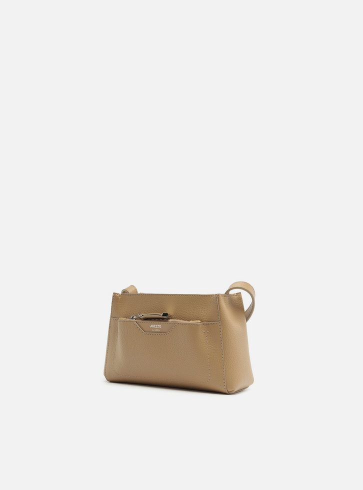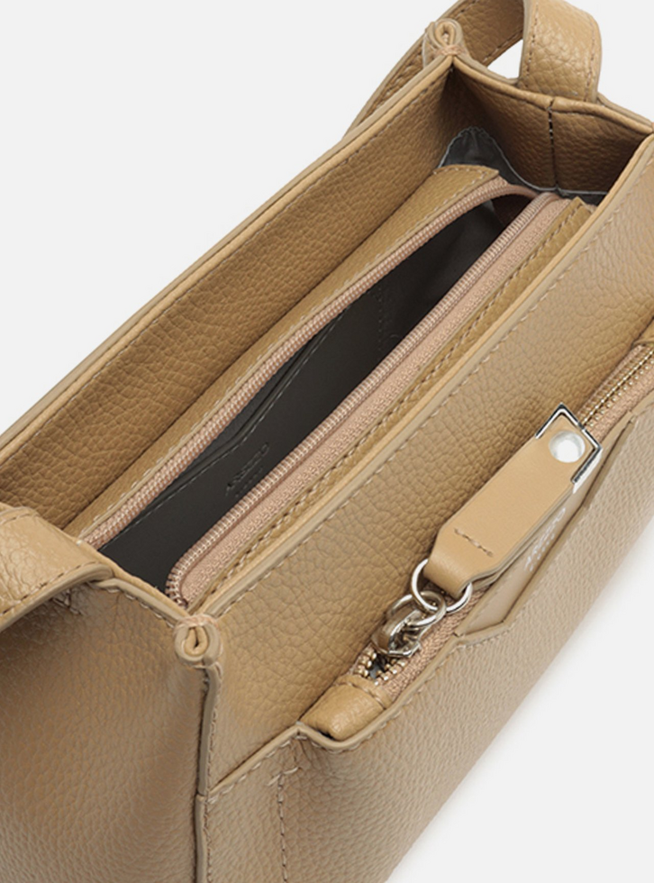 Bolsa tiracolo pequena cinza. O acessório tem formato retangular e acabamento texturizado. Traz alça tiracolo fina regulável. Com fecho superior em zíper. Possui bolso externo frontal, com detalhe em recorte, fecho em zíper, puxador e nome da marca.