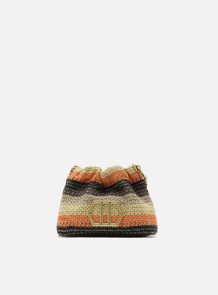 Bolsa tiracolo pequena colorida em palha. O acessório tem formato macio e capas em palha tramada com listras nas cores laranja, marinho, bege e marrom. Traz alça em corrente metálica dupla com tiras de couro entrelaçadas e detalhe em elos hexagonais, além de corrente simples com pingente. Possui borda superior franzida, com alça que passa por dentro, e fecho em imã interno. Com peça de metal dourada, geométrica e vazada aplicada na capa.