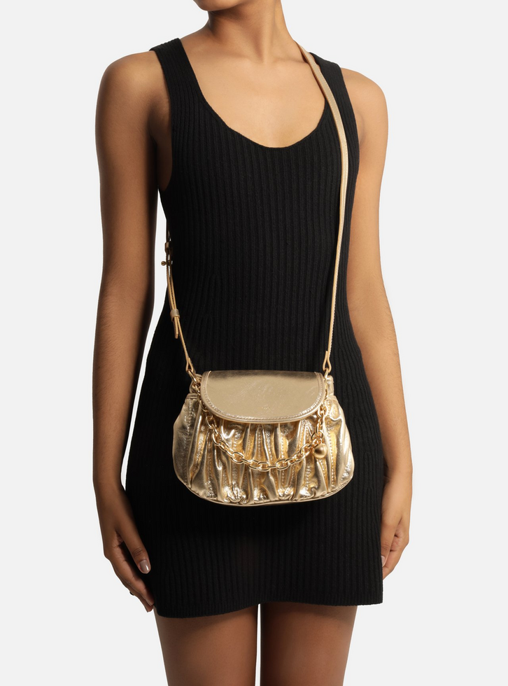 Bolsa Tiracolo Dourada Couro Pequena Franzido Corrente