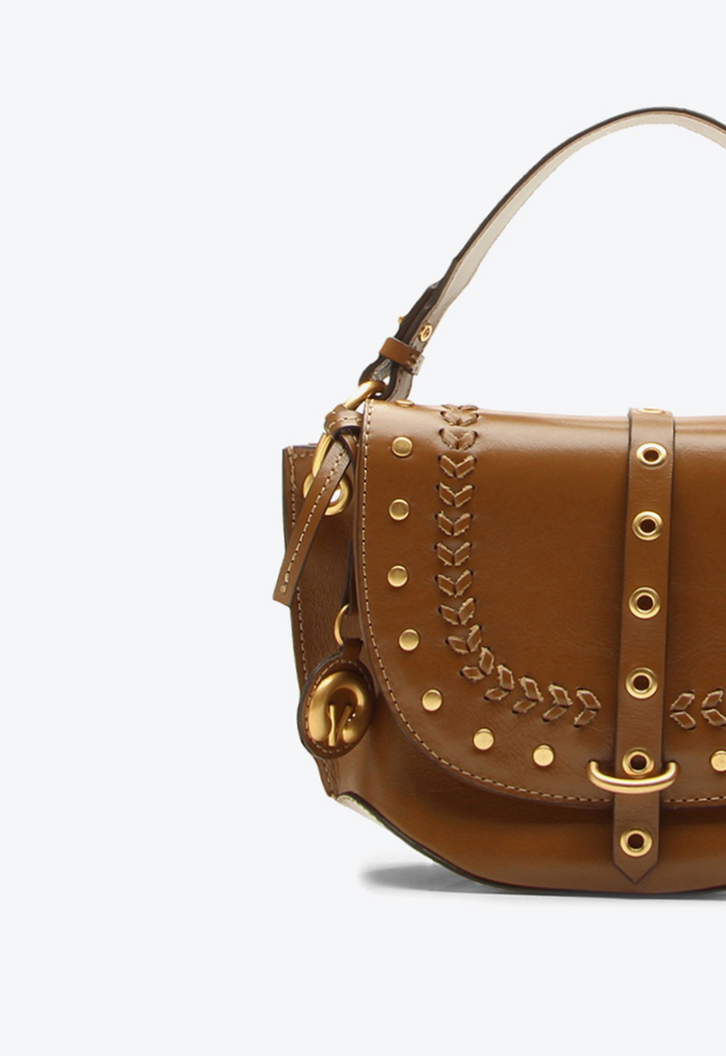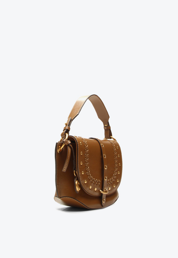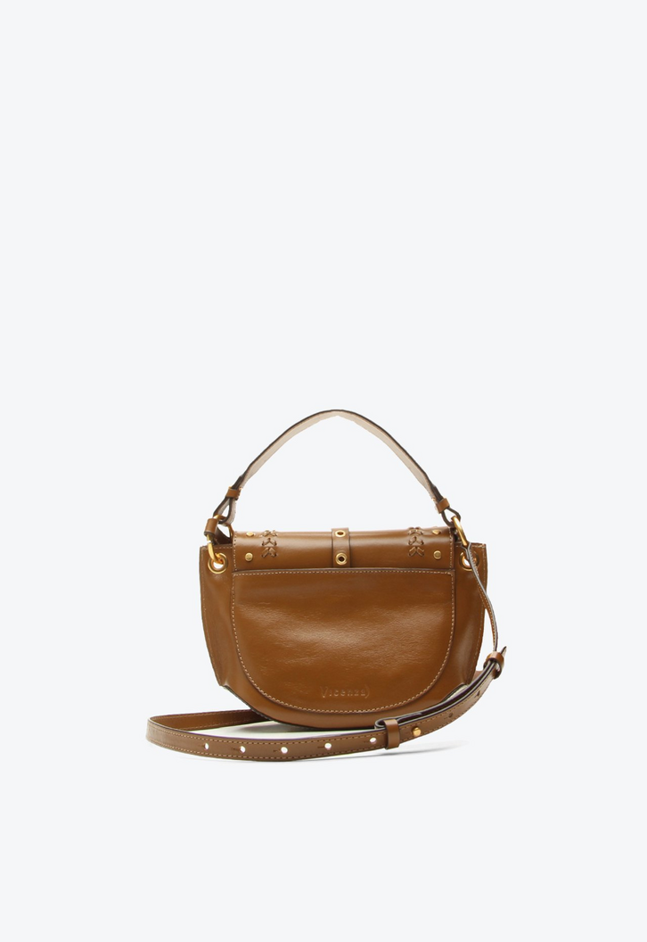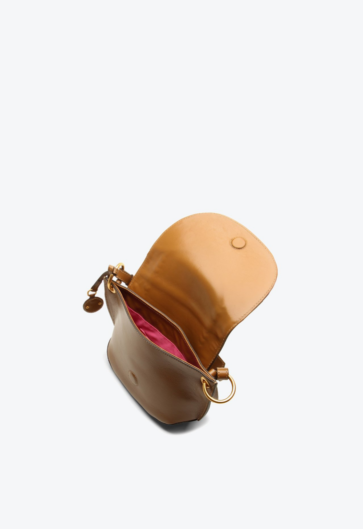 Bolsa pequena em couro caramelo com alça de mão. Com formato meia-lua, essa bag traz aplicações de adornos metalizados e fivela frontal, conferindo personalidade e estilo marcante em cada detalhe. Compacta e estruturada, a bolsa combina praticidade com design sofisticado. Uma escolha cheia de personalidade para os looks do dia ou da noite.